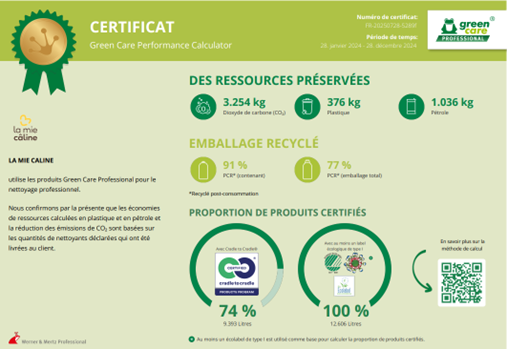 Face au challenge quotidien d’assurer un haut niveau d’hygiène tout en maîtrisant son empreinte écologique, l’enseigne fait confiance à Green Care Professional. Ce partenaire reconnu propose des produits performants éco-conçus déployés progressivement à l’échelle nationale au sein des magasins La Mie Câline depuis 2022.